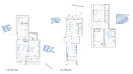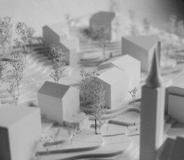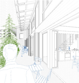 Der Städtebau verwirft die naheliegende Variante eines kompakten, viergeschossigen Mehrfamilienhauses mit zentraler Erschliessung und einem Eingang. Der Entwurf setzt auf zwei dreigeschossige Häuser, die dem dörflichen Kontext und dem städtebaulichen Massstab Rechnung tragen. Die Gasse zwischen den beiden Häusern schafft einen informelle Wegverbindung, wodurch die Neubebauung ins Quartier eingebunden wird. Die beiden Häuser sollen keine Vorder- und Rückseite haben. Die Adressierung erfolgt beidseitig. Alle Wohnungen sind direkt vom Aussenraum her erschlossen. Die Umgebungsgestaltung schafft viele Orte der Aneignung und des Aufenthalts – sei es direkt vor der Wohnungstüre, auf dem gemeinschaftlichen Vorplatz oder an der Feuerstelle. Die typologische Vielfalt – Maisonette- bis Studiowohnungen – findet eine präzise architektonische Umsetzung in einem stringenten Holzbau.