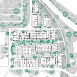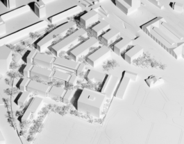 ReUse als Entwurfsfaktor: Als Ausgangspunkt des Städtebaus dient die Idee einer konsequenten Wiederverwendung der Betonrippendecken des Lysbüchel-Parkhauses. Daraus leitet sich das städtebauliche Prinzip ab. Es basiert auf der additiven Komposition dreier Grundtypen: Dem Tragwerk aus ReUse-Betonrippendecken, additiven Erweiterungsbauten und punktuellen Kopfbauten. Die situative Gliederung und Adaption der genannten Typen verleiht dem Städtebau trotz seiner rigiden Zeilenstruktur eine räumliche Vielfalt. Die Differenzierung der Hof- und Zwischenräume schafft ein reiches Umfeld. Die beiden Hofräume der Zeilen auf Baufeld C verfügen über unterschiedliche Qualitäten und Funktionen: Der südliche Hofraum funktioniert als Werkgasse, von der sämtliche Häuser erschlossen werden. Hier wird gespielt, gewerkt, getanzt. Die Oberflächen sind mehrheitlich mineralisch. Als Referenz dienen die Haarlemmer Houttuinen in Amsterdam von Herman Hertzberger. Trotz der rigiden Grundstruktur entsteht ein vielfältiger Mix an unterschiedlichen Wohnqualitäten. In den Kopfbauten befinden sich mehrheitlich die Kleinwohnungen. Die Zeilen auf Baufeld C verfügen aufgrund der räumlichen Dichte über einen grösseren Anteil an durchgesteckten Wohnungen, die bei einer Gebäudetiefe von fast vierzehn Metern eine bessere Belichtung ermöglichen. Als Familienwohnungen sind insbesondere die Maisonettewohnungen prädestiniert, die im Erdgeschoss über einen direkten Bezug zum Aussenraum – und in den Obergeschossen über einen privaten Balkon verfügen.
